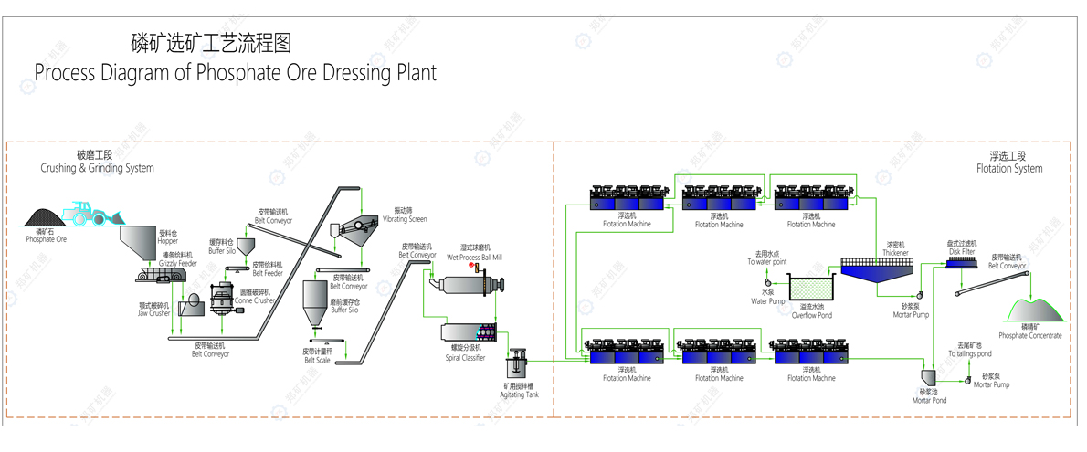 在對(duì)于磷元素的提取過(guò)程中,我們需要將大塊的磷礦石破碎、研磨成細(xì)粉,因此在選礦的過(guò)程中,就需要使用破碎機(jī)和球磨機(jī)這兩種類型的設(shè)備。研成粉末以后的磷礦由于磷礦石可浮性都比較高,還需要借助浮選機(jī)等進(jìn)行選別,由此可知:磷礦石選礦流程主要包括:破碎篩分、磨礦、浮選、脫水、尾礦處理幾個(gè)階段。不同階段處理流程不同,使用的設(shè)備也不同,下面就來(lái)對(duì)于這些階段進(jìn)行分析。1、破碎篩分階段:這一階段主要是將大塊的磷礦破碎成小塊,破碎的時(shí)候,需要采用二級(jí)閉路或三級(jí)閉路工藝將0-350毫米的大塊磷礦破碎至15毫米以下的小顆粒物料,然后才能進(jìn)行后續(xù)的粉磨作業(yè),這一階段的篩分作業(yè),主要是為了保證破碎后的磷礦石顆粒均勻且都符合15毫米以下的要求;